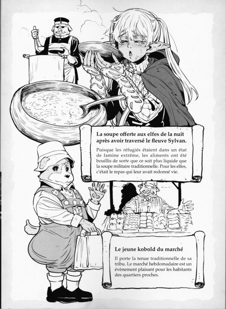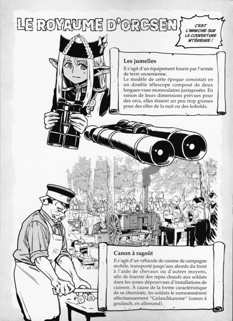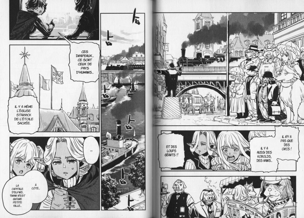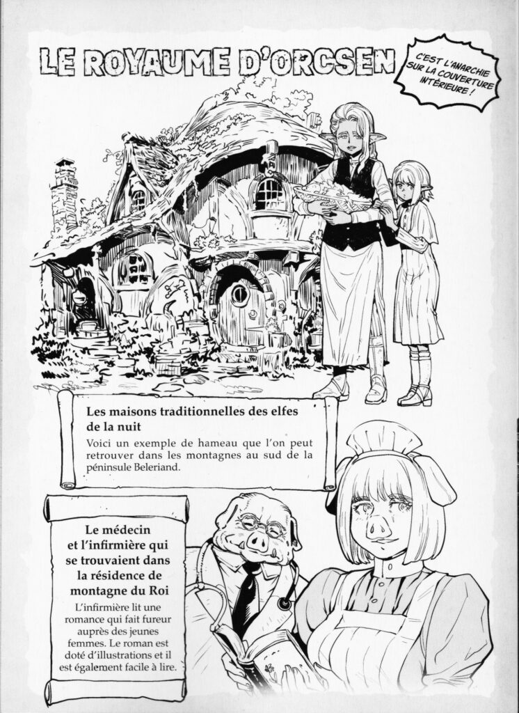 LE ROYAUME D’ORCSEN tire son nom du pays des Orcs dans l’œuvre. Et si l’on retrouve aussi des elfes du jour, de la nuit, des kobolds, des grands aigles et autres nains, l’image que nous propose Kyōichirō Tarumi s’éloigne des clichés de la fantasy. Comme la protagoniste Dinéluth Andariel, on ne peut qu’être surpris de l’aspect civilisé et l’humanité des Orcs ! C’est quelque chose de rafraîchissant.