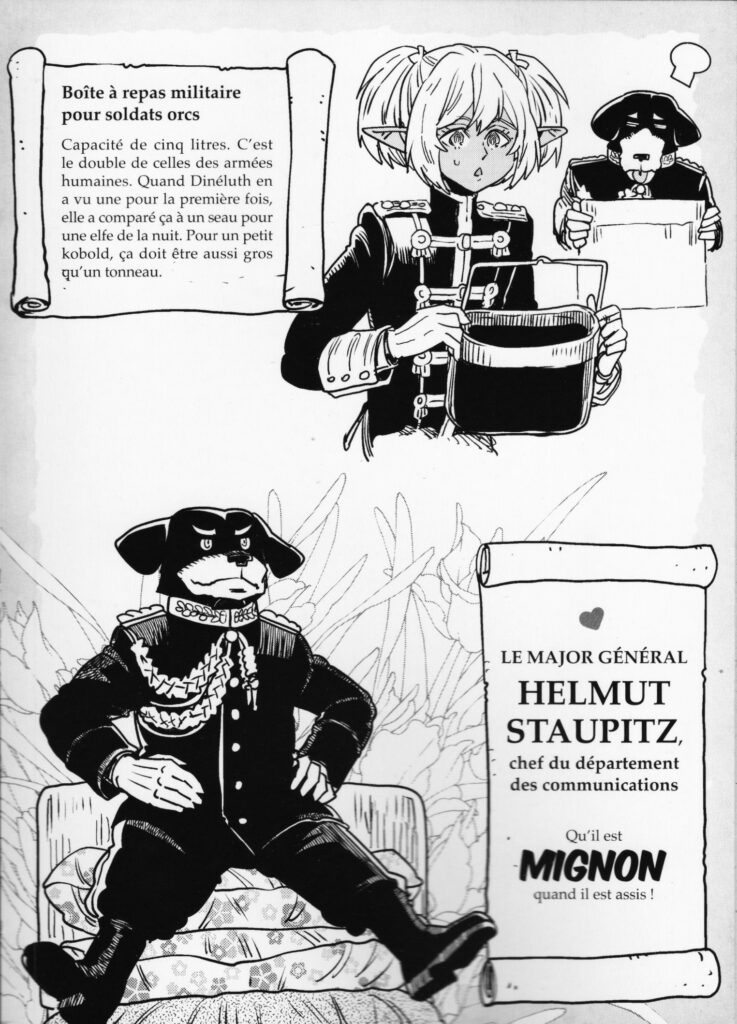 L’autre point d’originalité, c’est que les auteurs convoquent un autre imaginaire : celui de la Seconde Guerre Mondiale. Cela passe évidemment par les visuels : casques à pointes, uniformes et armes à feu ! Mais il y a aussi tout le lexique et les noms à consonnance germanique. La vision positive des Orcs couplée à une imagerie bien moins reluisante crée un décalage qui titille ma curiosités.
